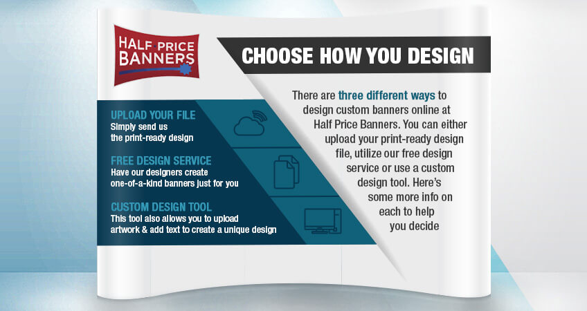 There are three different ways to design custom banners online at Half Price Banners. You can either upload your print-ready design file, utilize our free design service or use a custom design tool. Here’s some more info on each to help you decide: