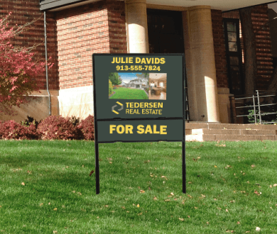 - Consider the size of your signage—When it comes to effective signage, size really does matter! Making sure that you choose the correct size for your sign could mean the difference between being seen and not. The size you choose could depend on the type of real estate you specialize in. For instance, if you specialize in commercial properties, large banner frames may be the most effective signage for you. Similarly, if your specialty is in selling residential properties, something as simple as a real estate yard sign would work perfectly. Whatever the case may be for you, make sure you pick an appropriately sized sign that will be visible to potential buyers even from a distance. Consider where you plan to place your signage and whether there are any obstacles that may be in the way. Simply put—if buyers can’t see your signs, then they can’t see your messaging.